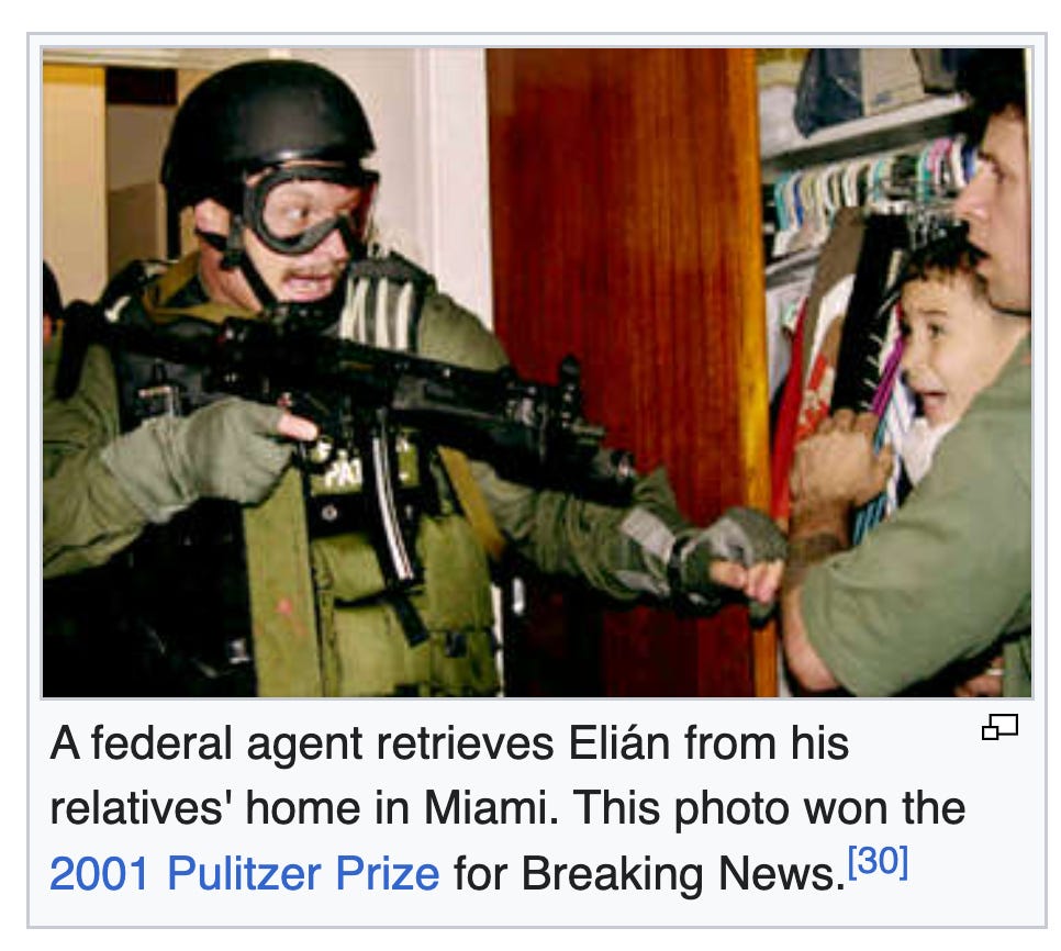 That got me thinking. Remember the Pulitzer Prize-winning photo by Alan Diaz for the AP, showing an INS agent (the precursor to ICE) pointing a 9-mm MP-5 submachine gun directly at a terrified little boy, Elian Gonzalez, who was hiding in a closet at the home of his Miami relatives? (Incidentally, to this day, the agent’s name remains unknown.)